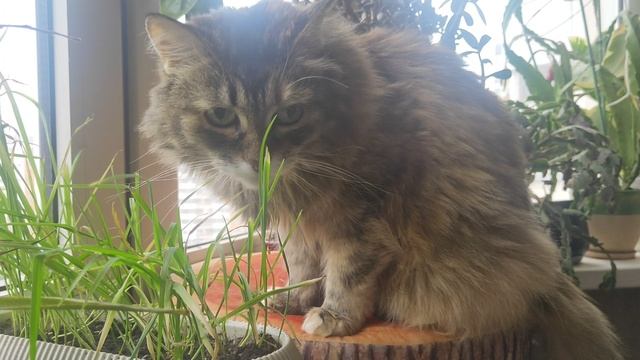 Кошка Марта грызёт травку