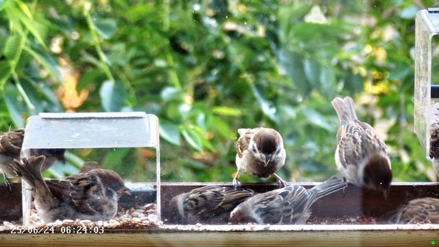 Птенцы воробья в кормушке летом