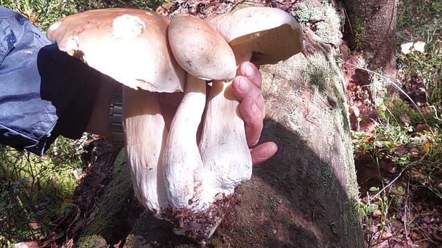 Грибы Боровики упрятались за бревно во мху, выросли втроем бльшими, крсивыми и чистыми.