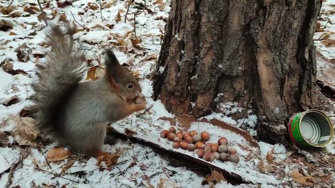 Белки прячут орехи около упавшей сосны