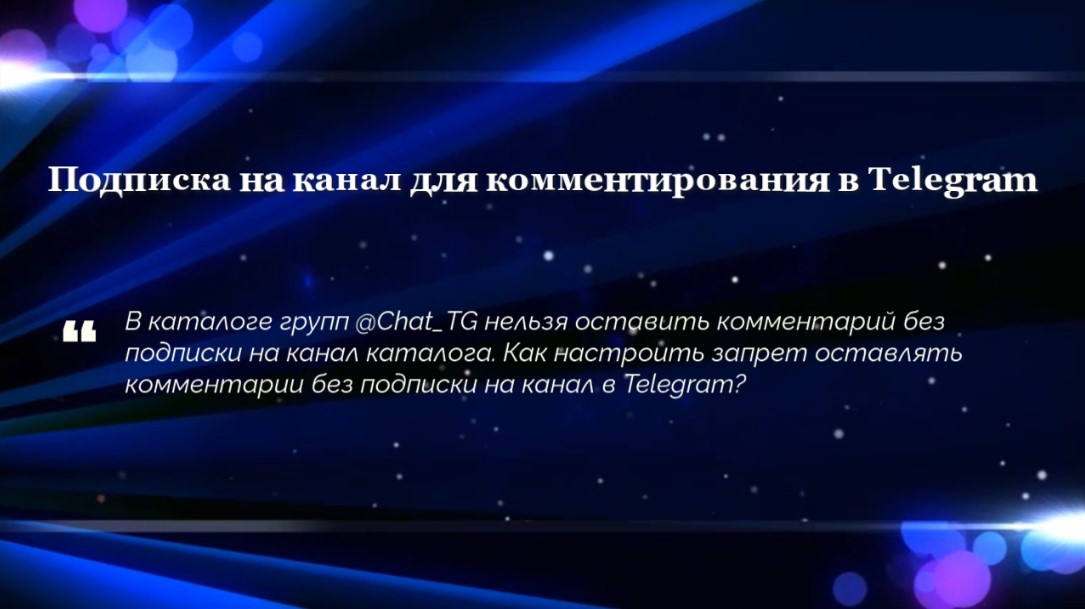 "В каталоге групп Chat_TG нельзя оставить комментарий без подписки на канал каталога. Как настроить запрет оставлять комментарии без подписки на канал в Telegram?" 🗣 Ответ на вопрос Запретить комментировать записи канала в Telegram без подписки на указанный канал можно при помощи бота ChatKeeperBot. Можно запретить писать сообщения в любой вашей группе без подписки на любой канал, который укажите в настройках. Как настроить? 1. В настройках "Тип группы" активируем чек-бокс, чтобы в группе могли писать только участники. Это может сделать создатель группы. 2. Добавляем администратором в группу бота ChatKeeperBot. 3. В разделе "Настройки", в подразделе "Приветствие" настраиваем модуль "Приветствие и проверка новых участников" для проверки подписки на канал. Бот будет приветствовать новых пользователей группы (вашим текстом) и проверять новых участников. Новый участник должен выполнить ваши условия проверки, чтобы начать общение в чате. Этот механизм можно также использовать для продвижения любых каналов. Например, в популярной группе для доступа к написанию сообщений указываете канал для продвижения. В видео подробно показан процесс настройки модуля для проверки подписки на канал. P.S. Для активации модуля в группе должна быть активирована лицензия Advanced в настройках ChatKeeperBot. Дополнительно: • Как узнать ID чатов в Telegram: https://t.me/Addinfo/1139 • Бот ChatKeeperBot: https://aff.su/ChatKeeperBot • Каталог групп в Telegram: https://aff.su/Chat_TG • Источник: книга "100 советов пользователю Telegram" https://Addinfo.t.me #Вопросы #Ответы #Боты #Группы #Комментарии #Telegram