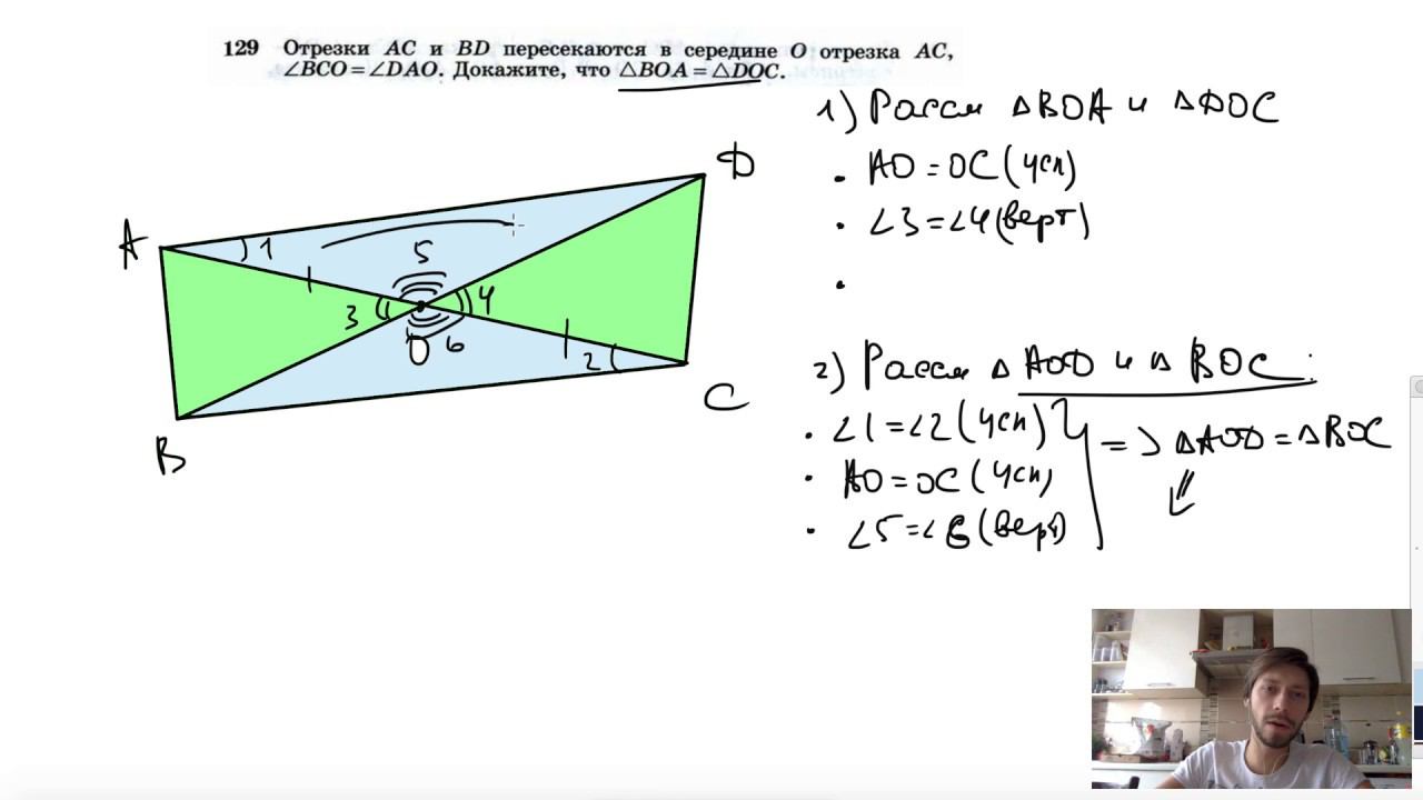 №129. Отрезки АС и BD пересекаются в середине О отрезка AC, ∠BCO = ∠DAO. Докажите, что ΔВОА=ΔDОС. Поддержать канал рублём - 5469400944002125 (Сбербанк) Мой второй канал для подготовки к ЕГЭ и ОГЭ - https://www.youtube.com/ЕвгенийСумин Инстаграм - https://www.instagram.com/EGE_OGE.math Личный инстаграм - https://www.instagram.com/ee_sumin VK - https://vk.com/evgeniysumin FB - https://www.facebook.com/EvgeniySumin