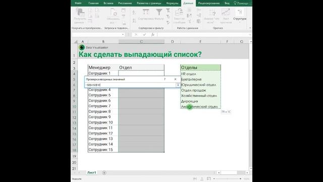 Хотите автоматизировать рутину? А исключить ошибки при вводе данных? Пользуйтесь выпадающими списками? Допустим, вам надо прописать отделы для всех сотрудников. Или прописать ответственных менеджеров по длинному списку задач. Сделать выпадающий список в Экселе, из которого вы просто будете выбирать нужное значение, очень просто! Буквально пару щелчков. Смотрим внимательно видео, следим за мышкой ? 1️⃣Составляем необходимый список (отделов, менеджеров, товаров и т.д). Именно этот список станет выпадающим 2️⃣Выделяем диапазон ячеек, в которые мы будем вставлять данные из этого списка 3️⃣Вкладка Данные— Работа с данными — Проверка данных 4️⃣В появившемся диалоговом окне: ▪️тип данных: «Список» ▪️источник: ставим равно и выделяем диапазон нашего списка ▪️жмём Ок! Посмотрите как стало легко заполнять ячейки! одно удовольствие! ? И, самое главное, другие сотрудники не допустят ошибки при вводе данных, т.к. вводить значения они смогут только те, которые появляются в выпадающем списке? Сам список я обычно переношу на другой лист и скрываю его. Чтобы не загромождал вид) ❤️Лайк от тех, кто будет использовать этот приём или уже использует. Или просто кому понравилось музыкальное сопровождение ?? Хорошего всем лёгкого дня! ☀️ ---------------------------- ? Ссылки на актуальные ресурсы школы: ▪️ Сайт школы. Индивидуальное и корпоративное обучение https://excellentschool.ru ▪️ Наш блог в Instagram https://www.instagram.com/data.vis ▪️ Telegram-канал о визуализации данных https://t.me/excellent_school ▪️ Основатель школы Ольга Базалева https://www.instagram.com/olga.bazaleva/ ? Полезные материалы: ▪️ Бесплатный мастер-класс «Как быстро и качественно визуализировать любые данные?» https://excellentschool.ru/data_visualization ▪️ Сборник статей школы «Об отчетах весело и со вкусом» за подписку на наши новости https://excellentschool.ru/subscribe ▪️ Книга «Мастерство визуализации данных. Как доносить идеи с помощью графиков и диаграмм» https://www.ozon.ru/context/detail/id/147417591/ ? Обучение: ▪️ Марафон «Фишки Excel» 55 приемов за 10 дней https://excellentschool.ru/marathon_excel ▪️ Курс «Мастер наглядных отчетов в Excel» 2.0 https://excellentschool.ru/master_datavis ▪️ Курс «Интерактивные отчеты в Excel» https://excellentschool.ru/dashboard ▪️ 60 профессиональных шаблонов диаграмм https://excellentschool.ru/diagrams
