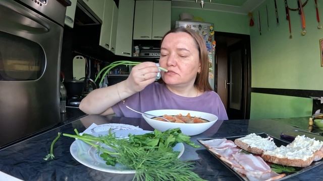 Борщ, бутерброды сыр с чесноком, бекон. Мукбанг
