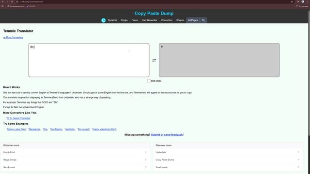 сегодня я вам покажу интересный переводчик на язык темми!!! ссылка на переводчик: https://c.r74n.com/converter/temmie(там есть другие переводчики, можете глянуть) а ещё простите за хреновое качество