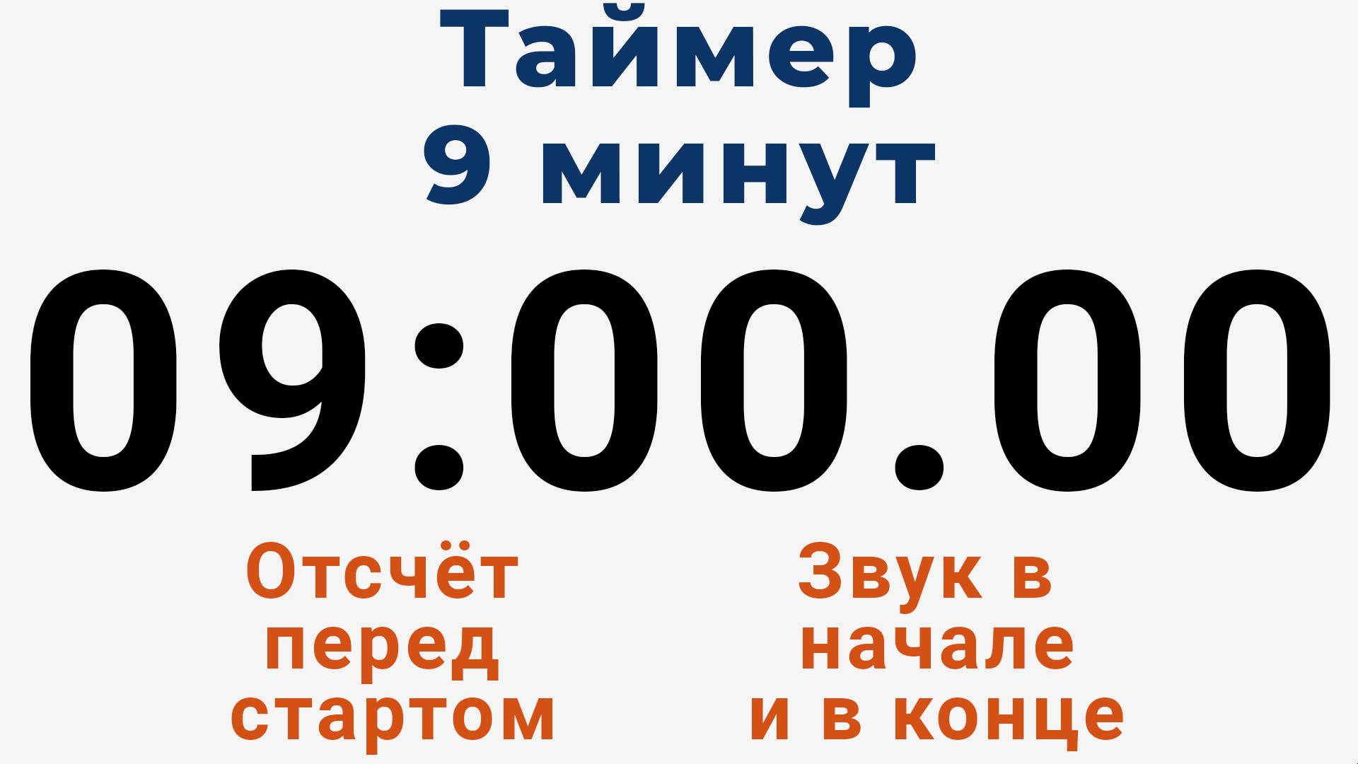 Таймер на 9 минут с отсчётом перед стартом и звуковыми сигналами в начале и по завершении девяти минут. Дополнительные настройки доступны на сайте канала - https://sekundomer.online/timer/9-minutes/