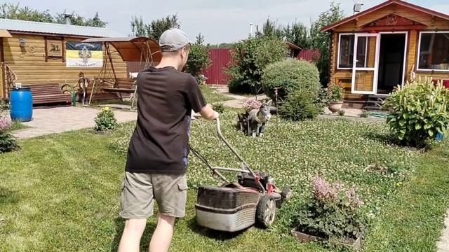 Артём показывает, как косить траву в частном доме.