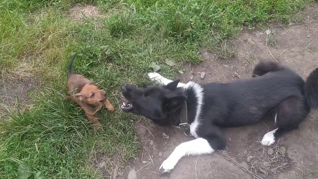 Русско-европейская лайка и такса. Шах и Люцик. Начало долгой дружбы.