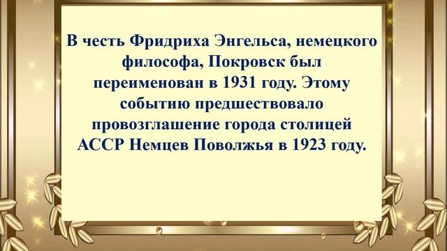 Есть в нашей жизни прекрасная традиция – отмечать юбилеи. Юбилеи бывают разные – маленькие и большие, радостные и грустные. Но это всегда итог, итог прожитого отрезка жизни. Город Энгельс прошёл непростой исторический путь. Нам есть чем гордиться, кого славить, помнить и чтить. Люди – главное достояние нашего города. Юбилей – это прекрасный повод, чтобы обратиться к своим истокам, активизировать деятельность в направлении изучения истории родного края, восстановить связь времён. 2022 год – это юбилейный год для нашего города, он празднует своё 275-летие. Библиотека-филиал № 31предлагает всем желающим совершить онлайн-экскурс «Листая страницы твои в юбилей» и познакомиться с историей города Энгельса, с его достопримечательностями.