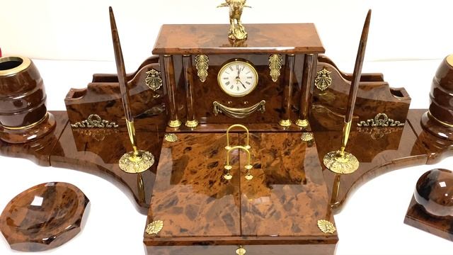 •Материал: обсидиан, кварцовый механизм, латунь, бронза. •Техника исполнения: камнерезные работы, токарные работы. •Упаковка: деревянный ящик обтянутый кожзамом. размер 800*310*420мм. •Размеры: при плотной компоновке на столе 950*340*280мм. - Основание под часы 240*105*35мм-1шт. - Часы 240*100*300мм -1шт. - Карандашница 95*95*135мм-2шт. - Основание под карандашницу 125*140*20мм-2шт. - Бумажница 180*250*140мм-2шт. - Календарница 240*220*80мм-1шт. - Ручки 10*10*200мм-2шт. -Подставка под шар 70*70*15мм-1шт. -Шар диаметр 65мм-1шт. -Флаг на подставке 85*85*305мм-1шт. •Вес нетто: 19кг. •Вес брутто: 33кг. Цена: 121 750 руб. https://radugakamnya.ru/catalog/suveniry_iz_kamnya/suveniry_iz_obsidiana/pismennye_nabory_iz_obsidiana/nastolnyy_nabor_iz_obsidiana_orel_950_340_300mm-613964/