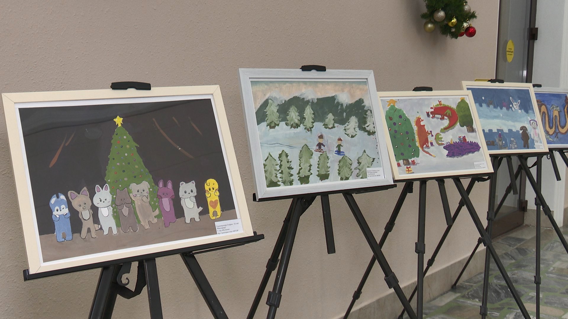 На экспозиции представлены работы юных учеников творческого арт-пространства. Дети сами придумали сюжеты рисунков, отразив в картинах символы зимнего праздника.