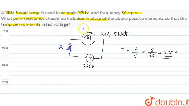 A `20 V` 5 watt lamp is used in ac main `220 V` and frequency 50 c.p.s. What pure resistance should be included in place of the above passive elements so that the lamp can run on its rated voltage?