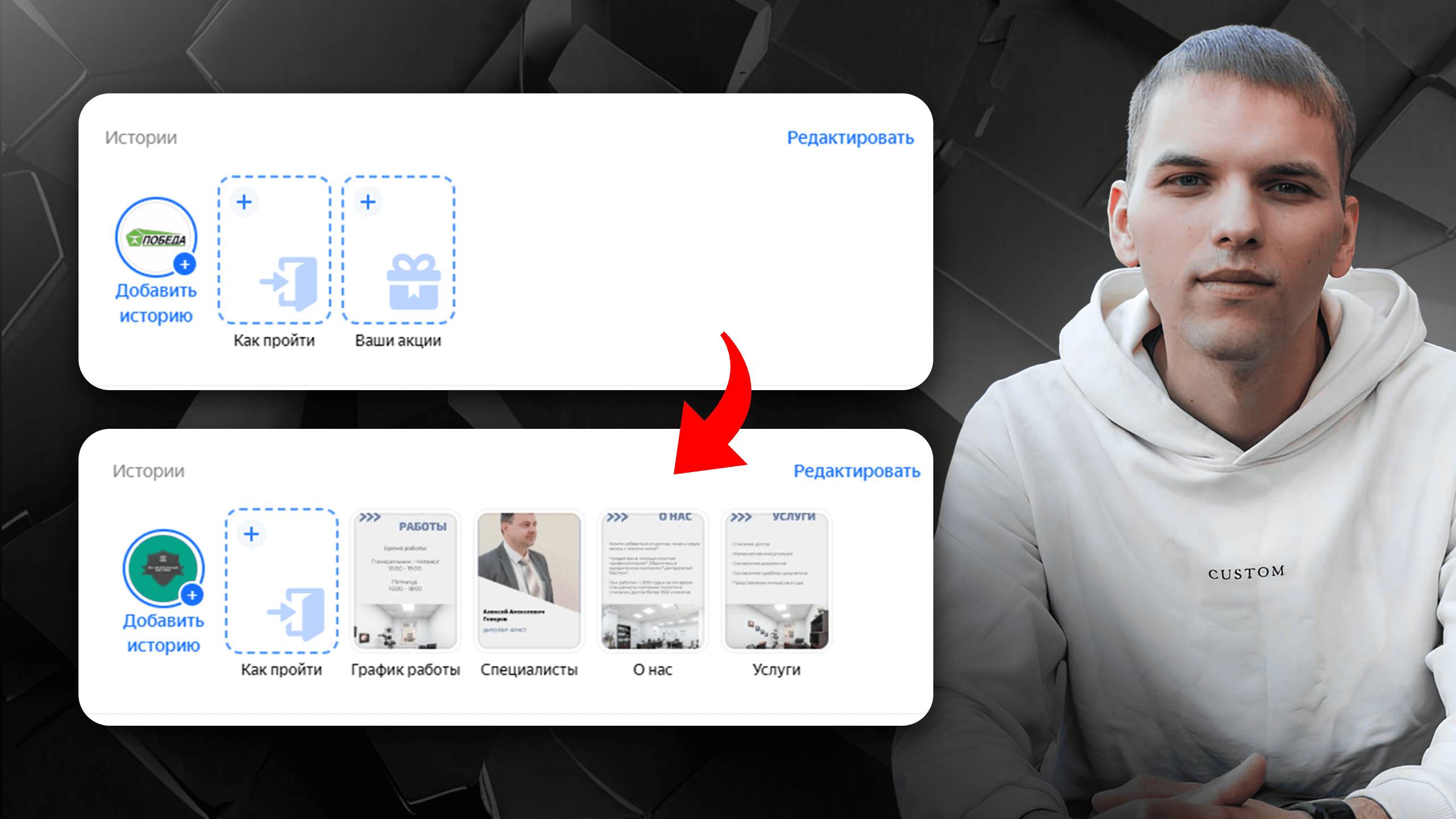 Подписывайтесь на соц. сети: ВКонтакте: https://vk.com/stas_sergeykin Телеграм: https://t.me/promarketing_biz Бесплатная консультация по маркетингу: Телеграм: https://t.me/sergeykinmarketing Телефон: +7 920 334 34 44 WhatsApp: https://wa.me/79203343444 Сайт: https://sergeykin-marketing.ru/ Промокод на увеличение рекламного бюджета на 5 000 руб: PERK-E468-47D6-B050 (Яндекс Бизнес) Промокод действителен до 20.03.2026 Ссылка для бесплатной активации промокода: https://yandex.ru/business/pref?pname=of_sergeykin Всем привет, в этом видео раскрою тему: Истории в Яндекс Картах. Как добавить. Как посмотреть. Как удалить. Буду показывать на примере нашего действующего клиента. С вами Станислав Сергейкин и на этом канале я рассказываю про маркетинг. Подписывайтесь! Будете знать, как привлекать клиентов из интернета! Другие видео по теме: Как ответить на отзыв в Яндекс Картах: https://rutube.ru/video/2b42d5ff885c329c01479583fca1fae7/?r=wd Как добавить организацию в Яндекс Карты: https://rutube.ru/video/12b2ca8d6ad82c1387fe8f16b49d8ed5/?r=wd --------------------------------- Тайм коды: 00:00 О чём видео. 01:44 Функционал историй. 05:29 Как пройти. 09:59 Требования к историям. 10:52 Какие разделы добавлять. 12:18 Истории от лица клиента. 13:03 Заключение. --------------------------------- #яндексбизнес #яндекскарты #историияндекскарты Возможно вы искали: яндекс карты продвижение яндекс карты отзывы яндекс карты настройка яндекс карты реклама