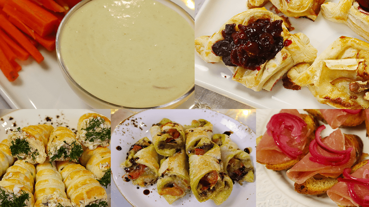 Друзья, всем привет. Сегодня подборка закусок для праздничного стола. ★Мини слоеные трубочки с начинкой. ✔Слоеное тесто ✔Огурец ✔Рыбные консервы ✔Яйца ✔Сметана или майонез ✔Соль, Перец ✔Укроп Приготовление: Сделаю из фольги конусы. Слоеное тесто, у меня дрожжевое, раскатала. Нарезаю на полоски и накручиваю на конусы. Смазываю тесто яйцом и отправляю на 180 градусов минут на 10. Нарезаем огурец. В миску перекладываю консервы рыбные, немного разомну вилочкой. Сюда же натираю яйцо, добавляю огурцы, сметану или майонез, соль и перец по вкусу. Теперь начинкой заполняем трубочки. Стороной, где видно начинку, окунаю в мелко порезанный укроп. И закуска готова. ★Закуска с помидором черри и моцареллой. ✔Тесто слоеное ✔Песто ✔Моцарелла ✔Помидор Приготовление: Слоеное тесто раскатываем и разрезаем на квадратики. В центр наносим немного песто, затем положу кусочек моцареллы и помидор формирую конверт и отправляю выпекаться на 180 градусов на 15-20 минут. Сверху немного полью бальзамическим уксусом. ★Слойки с бри вишней и грушей ✔Слоеное тесто ✔Сахар – 1 ст.л. ✔Крахмал – ст.л. ✔Вода – 50 мл. ✔Вишня- 200 гр. ✔Слоеное тесто – 250 гр. ✔Груша 1 шт. ✔Бри – 150 гр. ✔Яйцо для смазывания. Приготовление: Начнем с вишневого соуса. Вишню без косточек перекладываем в сотейник или другую емкость, добавляем сахар и ставим на огонь, можно немного подлить к вишне воды. Отдельно соединю крахмал и воду и хорошо перемешаем. Крахмал выливаем к вишне, увариваем еще буквально пару минут и снимаем с огня. Тесто разморозила, раскатываю и вырезаю квадрат. Теперь делаю надрезы по контуру квадрата, при этом нужно оставить 2 угла целыми. Формируем лодочку. Начинку положу по центру. Часть булочек сделаю с вишневым соусом и бри. Часть - с грушей и бри, голубым сыром, грецким орехом. Смазываю желтком и отправляю в духовку на 10-15 минут при 180 градусах. ★Брускетты с маринованным луком, балыком и бри. ✔Батон ✔Лук ✔Уксус ✔Сахар- 1 ст.л. ✔Соль ✔Сыр Бри ✔Балык ( или другое мясо) ✔Голубой сыр ✔Грецкие орехи Приготовление Красный лук нарезала тонко, теперь залью кипятком и тут же его солью. В баночку перекладываю лук, соль, сахар, уксус, у меня 9%, хорошо потрясу баночку и оставлю мариноваться минут на 20. Багет нарезала. Выкладываю его на противень, сверху бри и отправляю их в духовку на 180 градусов на 10 минут. Сверху положила тонко нарезанный балык и маринованный лук. Брускетта готова. ★Сырный соус (дип). ✔Сыр – 200 гр. (у меня российский 150 гр., с голубой плесенью – 50 гр) ✔Сливки жирные (у меня 33%) – 200 гр. ✔Острый перец ✔Соль ✔Мускатный орех ✔Чеснок ✔Для подачи, овощи и хлеб. Приготовление: Начнем с того, что запечем чеснок. У чеснока срежу верхушку, посыплю солью, перцем и полью маслом растительным, заверну в фольгу и отправлю в духовку на 200 градусов на 30-40 минут. Готовим соус, в кастрюльке соединила сливки и сыры, у меня российский и с голубой плесенью. Выбирайте те, которые нравятся вам. Добавляю для вкуса острый перец, соль, мускатный орех и черный перец. Ждем пока соус закипит и сыр расплавиться. Добавляю запечённый чеснок и хорошо блендерю смесь. Переливаю смесь в тарелочку, буду подавать со свежими овощами и хлебом. При остывании соус становится гуще, но не менее вкусным. Если хочется вернуть ему жидкую консистенцию, просто подогрейте его. Очень надуюсь что вы оцените сегодняшнюю подборку, и по
