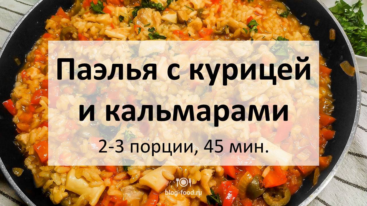 Всем привет. Совсем недавно мы делали паэлью с креветками, рыбой и овощами, а сегодня приготовим более традиционный вариант — с курицей и кальмарами. Тут меньше ингредиентов, однако за счёт болгарского перца результат будет более ярким и ароматным. • Кальмары, с/м, 200 гр. • Куриное филе, 180 гр. • Рис круглозёрный, 150 гр. • Лук, 1 шт. • Томаты протёртые, 100 гр. • Болгарский перец, 2 шт. • Оливки, 30 гр. • Чёрный перец, растительное масло, соль Лук и перец режем кубиком, курицу и кальмара — ломтиками, оливки разрезаем пополам. Курицу обжариваем на сильном огне три минуты, добавляем ломтики кальмара, обжариваем минуту, откладываем в сторону. В сковороду добавляем немного масла, обжариваем лук и перец в течение трёх минут, добавляем рис, томаты, жарим полминуты. Вливаем 500 мл бульона или воды, солим, перчим по вкусу, выкладываем сверху оливки, курицу с кальмарами, доводим до кипения, накрываем крышкой, готовим на слабом огне 25 минут. Подаём, украсив зеленью. Приятного аппетита! Текстовая версия на сайте: https://blog-food.ru/1215
