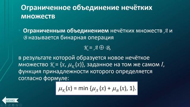 В видео представлены определения следующих операций над нечёткими множествами: 1) MAX-объединение; 2) MIN-пересечение; 3) Разность; 4) Симметрическая разность; 5) Алгебраические пересечение и объединение; 6) Ограниченные пересечение и объединение; 7) Пересечение и объединение Гамахера; 8) Пересечение и объединение Эйнштейна; 9) Усиленные пересечение и объединение; 10) Пересечение и объединение Ягера; 11) Дизъюнктивная сумма; 12) Операция -суммы. Подготовка презентации, озвучивание и монтаж: Медведев Никита. Видео также опубликовано на Яндекс.Дзен канале "Самостоятельная работа": https://zen.yandex.ru/media/id/603a418d1684900aa2499416/62d52e3e15d67a522fedca67