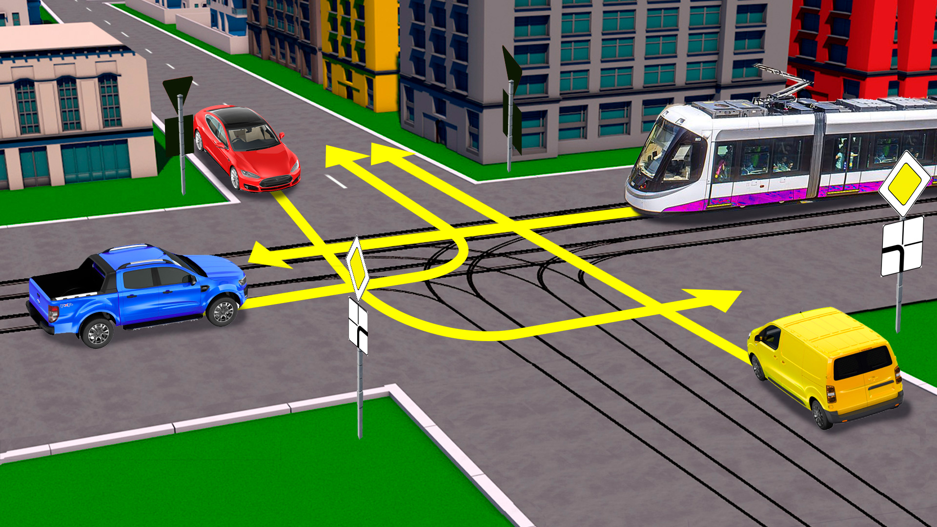 В какой последовательности проедут этот перекресток наши транспортные средства? Для безопасности проезда перекрестков, очень важно быстро и правильно определить очередность движения. Решите эту задачу сами и поделитесь задачей с друзьями. Возможно, им тоже будет интересно.