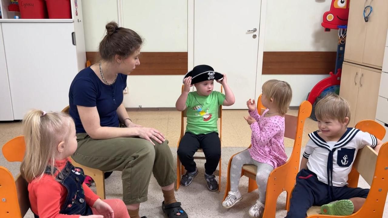 На занятии в группе поддерживающего обучения педагог Анастасия Фомина превращает простое упражнение в увлекательное общение и игру, способствующую развитию! На видео — коммуникативная игра «На ком надета шляпа». Как проходит игра? Дети собираются в круг. Под ритмичную песенку шляпа «путешествует» от одного ребёнка к другому: На ком надета шляпа, красивая шляпа, На ком надета шляпа, скорее посмотри! На Илюше шляпа, красивая шляпа, (все вместе указываем на Илюшу) На Илюше шляпа, скорее посмотри! Для чего нужна такая игра и что она развивает? 1. Коммуникация и социализация. Ребёнок учится замечать других детей, обращаться к ним по имени и быть в центре внимания сам, когда на него надевают шляпу. 2. Развитие речи и чувства ритма. Пропевание простых фраз в такт движениям помогает развивать речевой слух и артикуляцию. 3. Внимание и зрительный контакт. Нужно вовремя увидеть, на ком оказался головной убор, и переключить внимание с предмета на человека. 4. Координация движений. Надеть шляпу на соседа — это отличная тренировка мелкой и общей моторики. Эту игру легко повторить в семейном кругу или на детском празднике. Вам не нужно специальное оборудование — только любая привлекательная для детей шляпа и приятная компания. Это отличный способ весело провести время, помогая ребёнку стать более открытым и внимательным к окружающим. *Проект "Развитие ресурсов ребенка и семьи: подготовка к школе детей с синдромом Дауна" реализуется в рамках конкурса грантов «Москва – добрый город» при поддержке Департамента труда и социальной защиты населения города Москвы.