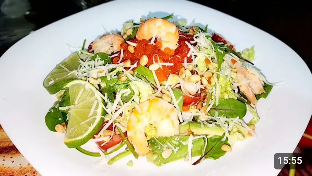 РЕЦЕПТ: Пекинская капуста.430.г. Креветки.800.г. Сыр из твердых сортов выдержанный.150.г. Чеснок.3.зуб. Помидоры черри.300.г. Икра лососевая.120.г. Авокадо.3.шт. Кедровые орешки.70. Миндаль.15.г. Кешью.15.г. Микс салат.450.г. Мята.3.вет. Мокрица.15.г. Сливочное масло.40.г. Оливковое масло.1.ст.л. Соль перец по вкусу. ДЛЯ ЗАПРАВКИ: Горчица.1.ч.л. Мёд.1.ст.л. Оливковое масло.2.ст.л. Лайм.1.шт. Морская соль.1/4.ч.л. ПРИЯТНОГО АППЕТИТА!?ПРОСТО И ВКУСНО!?
