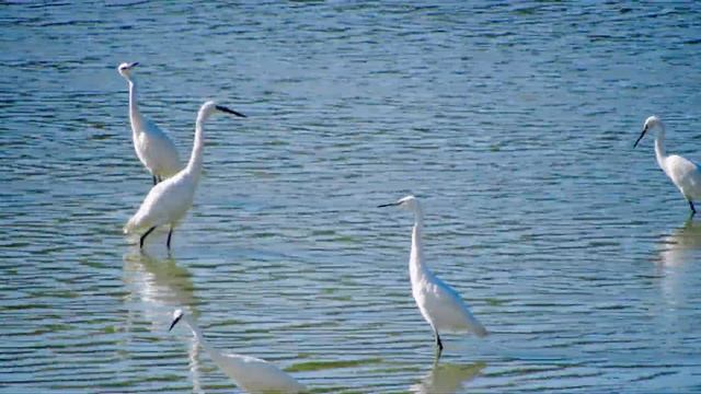 На отмелях и мелководье реки кубань, рядом с Рождественской набережной на ЮМР в Краснодаре, стая белых цапель остановилась отдохнуть и откормиться по пути в жаркие страны.