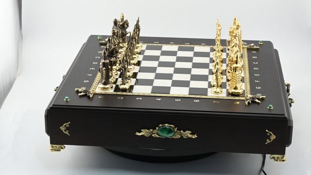 •Шахматный ларец изготовлен из дерева с элементами декора из бронзы. Ящики для фигур внутри обтянуты бархатом. Размер ларца 440*480*100мм. •Упаковано в деревянный кейс обтянутый искусственной кожей, размер 560*520*120мм. •Фигуры изготовлены из бронзы, доска из камня долерит и мрамор. •Размер игрового поля 280*280мм, размер клетки 35*35мм, размер пешки 22*20*72мм, размер короля 28*28*95мм. •Вес с упаковкой 17кг. •Рисунок и цвет камня уникален, поэтому может незначительно отличаться от экземпляра представленного на фотографии. Цена: 108 360 руб. https://radugakamnya.ru/catalog/suveniry_iz_kamnya/suveniry_iz_zmeevika_i_krenoida/shakhmaty_i_nardy_iz_zmeevika/shakhmatnyy_larets_rus_440_450_190mm-603853/