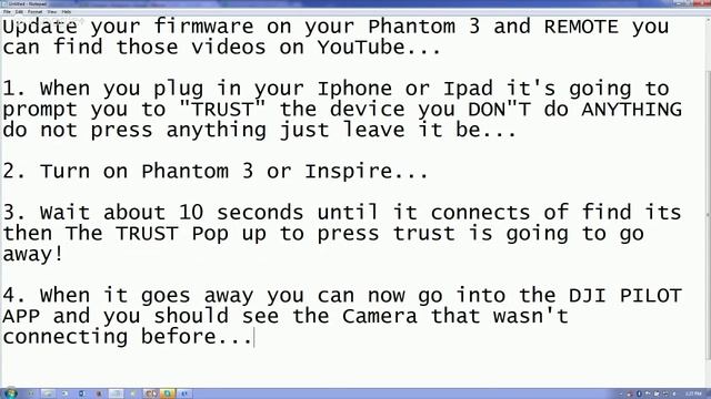 DJI Pilot App Phantom 3 For IOS 8 NOT Connecting http://facebook.com/certifiedlegacy - Add me on facebook for more information. The DJI Pilot app is designed specifically for the DJI Inspire 1 and Phantom 3. Now you can use the DJI Pilot APP with your Phantom 3 Advance/Professional flying platform. Our recommended devices, running iOS version 8.0 or later, are: • iPad Air 2 • iPad Air • iPad mini 3 • iPad mini 2 • iPhone 6 Plus • iPhone 6 • iPhone 5s Phantom 3 Professional and Advanced, DJI released the iOS version. We grabbed it, along with the associated and necessary firmware update, and had our Professional updated and ready to fly using our newly purchased iPad Mini 2 in about 30 minutes. DJI Pilot App Phantom 3 For IOS 8 NOT Connecting Tags: dji pilot app, dji pilot app iphone, dji pilot app ipad, dji pilot app not connecting, ios, DJI Pilot App Phantom 3, DJI Pilot App Inspire, Dji Pilot App Tutorial, dji pilot app mac, dji pilot app for apple, dji pilot app compatibility, dji pilot app waypoints, dji pilot app phantom, dji pilot app flight simulator, dji pilot app android, dji phantom 3, the dji inspire 1, phantom3 https://youtu.be/-nrNvomc5pM DJI Pilot App Phantom 3 For IOS 8 NOT Connecting