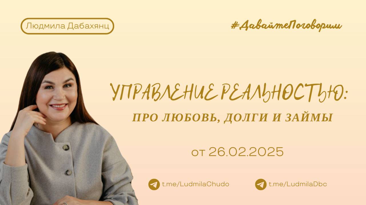 Рубрика #ДавайтеПоговорим от 26.02.25 Управление реальностью про любовь, долги и займы 💫записи прошлых разборов здесь 👉🏻 https://rutube.ru/plst/364320 ‼️ ВАЖНО: Уже в марте старт обучения работе с метафорическими картами. В основе обучения - метод вселенской терапии Л. Тальписа. Заходите в бот - https://t.me/ludmiladbc_bot и пишите "МАК", если хотите участвовать ‼️ канал #твАрец_реальности 2025 Подробнее: https://rutube.ru/video/2744940f7bab3063b818c926b2253dfc/ О канале: https://t.me/chatLudmilaChudo/4310 Заходите в бот - https://t.me/ludmiladbc_bot , если хотите участвовать Теперь в одном месте ты можешь посмотреть: ✔️ чем я могу быть для тебя и... ✔️ что я могу дать тебе Переходи: https://t.me/ludmiladbc_bot ✓ Обязательно поставь 💗 ✓ Подпишись на канал ✓ И поделись с близкими Это будет вашим балансом за движение и получение энергии. Если есть желание создать баланс брать-давать... приму от всего сердца с благословением (донейшн). С Огромной Любовью, Дабахянц Людмила 💓 ✨ Telegram: https://t.me/ludmiladbc ✨ Канал в telegram “Я ЕСТЬ”: https://t.me/LudmilaChudo ✨Онлайн-школа: https://ludmilachudo.skillspace.ru/school ✨Rutube: https://rutube.ru/channel/34371568/
