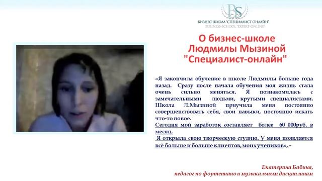 Учитель музыки о бизнес-школе Людмилы Мызиной "СПЕЦИАЛИСТ ОНЛАЙН" - выпускница Екатерина Бабина