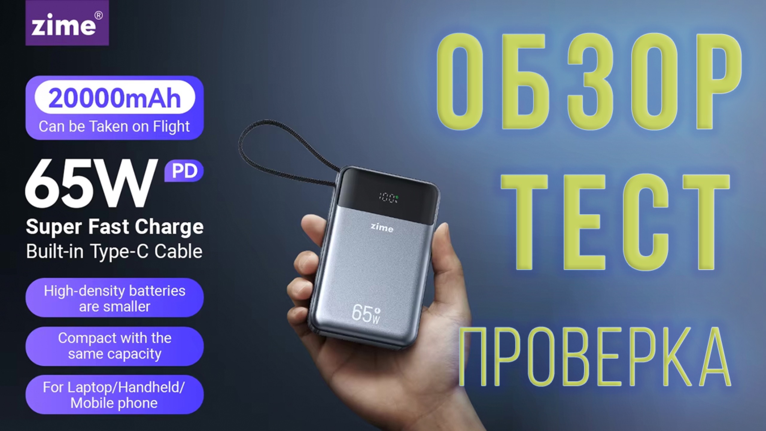PowerBank ZIME 65W со встроенным кабелем - распаковка, внешний вид, реальные тесты зарядки
