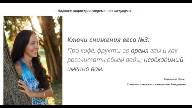 Ключи снижения веса №3: про кофе, фрукты во время еды и как рассчитать обьем воды, необходимый именно вам в течение дня. 📌 КТО ТАКАЯ ЮЛИЯ КРУШАНОВА? Сертифицированный специалист Аюрведы и интегративной нутрициологии. Биофизик, патофизиолог (МГУ, ММА им. Сеченова). Эксперт пульсовой диагностики. Преподаватель и автор программ https://krushanova.com/ Подпишитесь на канал, чтобы на регулярной основе получать полезные рекомендации по здоровью