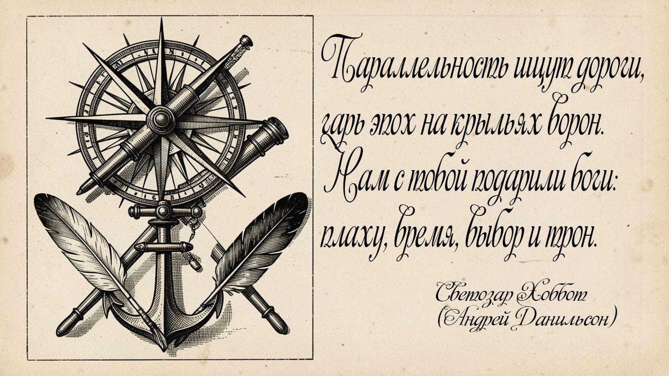 Безнадежность ничтожной мысли, в эпатажно больших глазах. Все исходники подзависли, трафаретами на углах. Дождь внезапно очнулся снегом, чистота назначает путь. Иноходцы гордятся бегом, непохожестью хоть чуть-чуть. На столе умирает роза, день рождения позади. Возвращаться в себя не поздно, лучше все таки до зари. Расточительно мало смысла в одиноких моих глазах. Наша жизнь назначает числа и спускается на тормозах. Параллельность ищут дороги, гарь эпох на крыльях ворон. Нам с тобой подарили боги: плаху, время, выбор и трон. И мы крутим в руках свободу, кубик Рубика наших дел, Вместо радости — дуем на воду, и считаем остаток стрел. Кто мы? Тени теней ушедших? Или ветры других миров? Песни праведных и безгрешных, или боли святых голов? Где мы? В мире голодных судеб, или в ямах правдивой лжи? Кто нас вытащит и рассудит, кто нам выправит миражи? © Copyright: Андрей Данильсон, 2021 Свидетельство о публикации №121080502110 Все права на песню принадлежат мне. #оркестрсветозарахоббота #сунотрек #русскаярокмузыка #авторскаялирика #неформат #поддержинезависимых #роликипроразмышления #новаямузыка