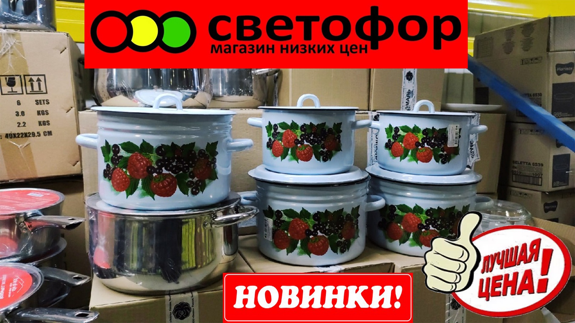 А в Светофоре продают недорогую, но хорошую посуду. Наборы эмалированных кастрюль, ковшик из нержавейки, салатники и другое.