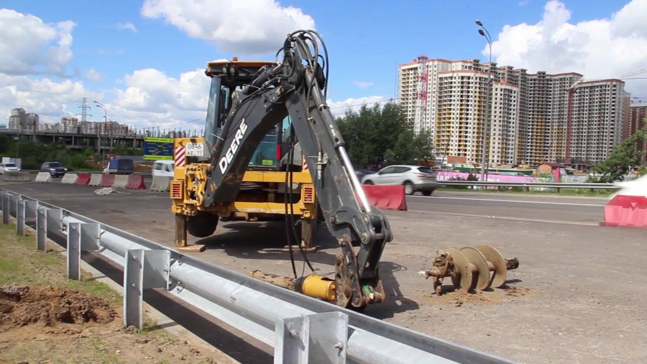 Гидробур Delta RD-8 на экскаваторе-погрузчике John Deere 315SK работает в Подмосковье на пересечении Минского и Можайского шоссе. Навесное оборудование занято на бурении отверстий под столбы электроосвещения. http://gidromolot.tradicia-k.ru/product/gidrovraschatel-delta-rd-8/