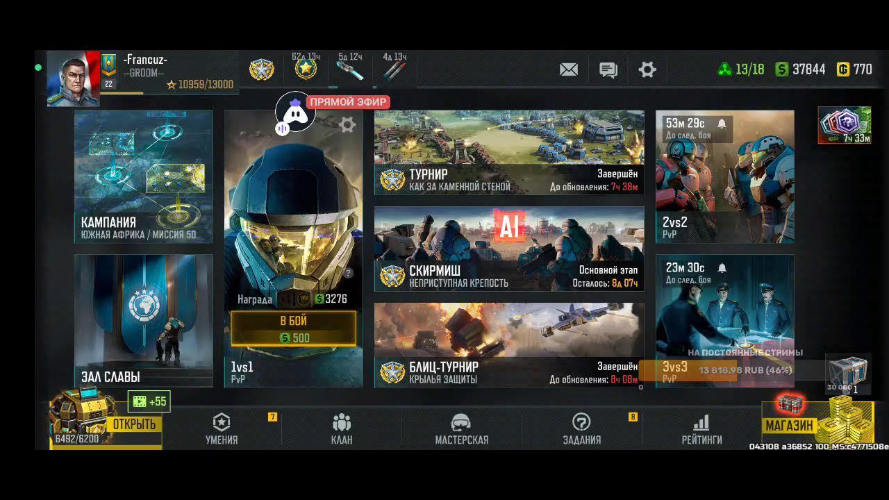 Поддержка автора по ссылке: https://www.donationalerts.com/r/rincks райффазен банк 2200 3005 1695 5281 телеграм группа для подписчиков https://t.me/art_of_war_3_rincks_sopra Продлить стрим:300 руб Смена фракции:200 руб Тренировка:300 руб 2х2: по совести Покажи кач: миллион рублей Закончить стрим:1000 руб Так же можно заказать челлендж. тоесть дать стримеру задание за определенную сумму. Например: сыграть только авиацией или вообще без неё,ну и так далее. Ссылка на игру: Долго искал настоящую стратежку на телефон, как старкрафт. Наконец нашел Art of War 3! Очень крутая игра! Вот ссылка, качай, тебе понравится: https://redirect.appmetrica.yandex.com/serve/169878688668608468?recruiter_id=1111515909