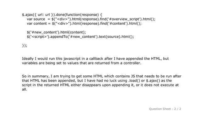 jQuery : jQuery .load() / .ajax() not executing javascript in returned HTML after appended [ Beautify Your Computer : https://www.hows.tech/p/recommended.html ] jQuery : jQuery .load() / .ajax() not executing javascript in returned HTML after appended Note: The information provided in this video is as it is with no modifications. Thanks to many people who made this project happen. Disclaimer: All information is provided as it is with no warranty of any kind. Content is licensed under CC BY SA 2.5 and CC BY SA 3.0. Question / answer owners are mentioned in the video. Trademarks are property of respective owners and stackexchange. Information credits to stackoverflow, stackexchange network and user contributions. If there any issues, contact us on - htfyc dot hows dot tech #jQuery:jQueryload()/ajax()notexecutingjavascriptinreturnedHTMLafterappended #jQuery #: #jQuery #.load() #/ #.ajax() #not #executing #javascript #in #returned #HTML #after #appended Guide : [ jQuery : jQuery .load() / .ajax() not executing javascript in returned HTML after appended ]