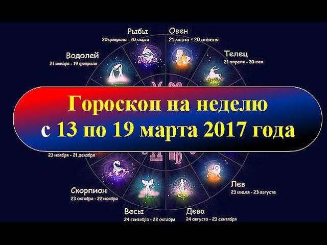 Гороскоп на неделю с 13 по 19 марта 2017 года Для просмотра гороскопа используйте тайм код для знаков зодиака, расположенный ниже. 0:36 - Овен 2:02 - Телец 3:30 - Близнецы 4:58 - Рак 6:22 - Лев 7:41- Дева 9:02 - Весы 10:21 - Скорпион 11:47- Стрелец 13:03 - Козерог 14:20 - Водолей 15:38 - Рыбы 16:50 - Именины на этой неделе