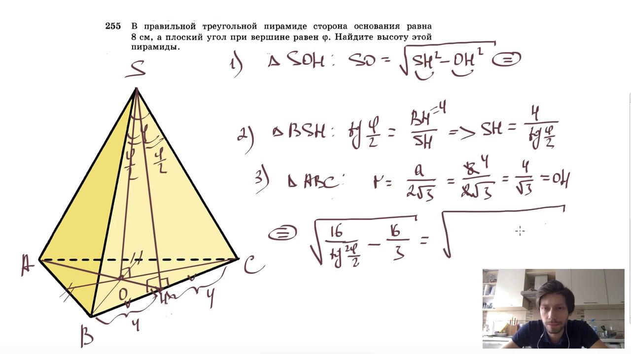 №255. В правильной треугольной пирамиде сторона основания равна 8 см, а плоский угол при вершине равен φ. Найдите высоту пирамиды. Поддержать канал рублём - 5469400944002125 (Сбербанк) Мой второй канал для подготовки к ЕГЭ и ОГЭ - https://www.youtube.com/ЕвгенийСумин Инстаграм - https://www.instagram.com/EGE_OGE.math Личный инстаграм - https://www.instagram.com/ee_sumin VK - https://vk.com/evgeniysumin FB - https://www.facebook.com/EvgeniySumin
