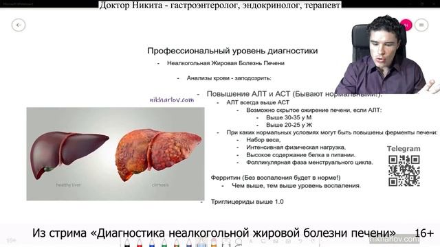 Ожирение печени. УЗИ МРТ при неалкогольной жировой болезни печени. Фиброскан, Эластометрия. Инструментальные методы диагностики неалкогольной жировой болезни печени (НАЖБП) доступны для всех пациентов и позволяют достаточно точно выявить наличие жира в печени. Если жир не обнаруживается, но есть проблемы, это может указывать на цирроз печени. Методы визуализации печени: ● УЗИ органов брюшной полости – начальный этап, который в сочетании с биохимическим анализом крови позволяет выявить ожирение печени. ● МРТ органов брюшной полости – наиболее информативный метод, применяемый при сомнительных результатах УЗИ. ● КТ органов брюшной полости – используется редко из-за низкой эффективности в визуализации мягких тканей. ● Эластография печени (фиброскан) – определяет эластичность и жёсткость печени. Далее следует лабораторная диагностика – профессиональный метод, включающий биохимический анализ крови. Однако он не даёт абсолютно точного подтверждения НАЖБП. В лаборатории определяются: ● Ферменты печени АЛТ и АСТ. Их повышение может указывать на заболевание, но не является специфичным признаком. ● Ферритин – повышенный уровень сигнализирует о возможном воспалении печени. ● Триглицериды – увеличение концентрации может свидетельствовать об ожирении печени. 📕 Подробное и поэтапное Руководство о Диагностике и Лечении жировой болезни печени вы можете найти на сайте nikharlov.com: https://bit.ly/End-Fatty-Liver-Guide Диагностика и лечение печени. #ПеченьОжирение #ПеченьУзиМрт #ПеченьДиагностика #ПеченьАнализы #ФерментыПечень ===== Информация в данном видео предоставлена для ознакомления и расширения кругозора. Не является призывом к действию, НЕ заменяет консультации вашего лечащего врача. По вопросам вашего здоровья и возможных действий проконсультируйтесь с вашим медицинским профессионалом. ===== dr nik, doctor nikita, dr nikita, doctor nik, никита харлов ▶️ Полная лекция: Ожирение печени Диагностика неалкогольной жировой болезни печени. Признаки жирной печени. https://www.youtube.com/watch?v=MiFyanAJSOc 📕 Плейлист: Жирная печень лечение и диагностика неалкогольной жировой болезни печени. Признаки ожирения печени. Доктор Никита Лекция. Гепатология. https://www.youtube.com/playlist?list=PLMLarg_xd_Mo5g9RlDxnpKoPsEAlbMGkM ⭐️Углубленные лекции https://academy.nikharlov.com 🩸Новый канал Доктора Ника https://bit.ly/DrNikNew ✅ Консультации с доком Никитой https://nikharlov.com/consult/ 💎Сайт Доктор Ник https://nikharlov.com/ 💧Лекция ЭЛЕКТРОЛИТЫ https://bit.ly/Na-K-Cl ❗Лекция: Йод, Селен, Марганец, Глутатион https://bit.ly/OxSeIMnGS 🔑Лекция: Железо, Цинк, Медь, Витамин С https://bit.ly/CuFeZn-VitC 💯Полезный телеграм https://bit.ly/TG-fat 💜Как помочь творчеству https://t.me/udothis/1305 🟠Лекция Вит. B1,2,3,5,6,7 https://bit.ly/EnergyVitsB 🔵Лекция МЕТИЛИРОВАНИЕ https://bit.ly/MethylatioN1k 🏆Поддержать творчество! https://bit.ly/joiN1k 💌Составить Биоценный рацион питания https://bit.ly/BioJournalNik 🎁Лекция