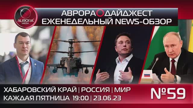 59-й еженедельный новостной видео-разбор АВРОРА⭕️ДАЙДЖЕСТ, сделанный Редакцией в формате: Хабаровский край | Россия | Мир, с ключевыми региональными, российскими и международными событиями: Содержание: ┃00:00┃▸ Вступление ┃00:30┃▸ В этом выпуске ⭕️ НОВОСТИ ХАБАРОВСКОГО КРАЯ: ┃01:20┃▸ Хабаровский край в числе Первых на Международном экономическом Форуме в Петербурге. ┃02:19┃▸ Регион укрепляет сотрудничество с Белоруссией. ┃03:07┃▸ Восточный вектор: мэр Краевой столицы с рабочим визитом в Китай. ┃03:52┃▸ Масштабный всероссийский фестиваль Дня молодежи стартует в Хабаровске. ┃04:27┃▸ Гимнастки региона лучшие на международном финале Гимнастрады. ┃04:52┃▸ Центр уличного баскетбола построят в Краевой столице. ┃05:51┃▸ Экспедиция из Хабаровска длиною в 7 тысяч километров. ⭕️ НОВОСТИ РОССИИ: ┃06:05┃▸ Превосходство в воздухе: Российская авиация громит контрнаступление ВСУ. ┃07:13┃▸ Главное из переговоров Владимира Путина с лидерами африканских стран. ┃07:52┃▸ Яндекс оштрафован на 2 млн. рублей из-за отказа предоставить информацию. ⭕️ НОВОСТИ МИРА: ┃08:23┃▸ ЕС готовит очередной пакет военной помощи Украине на 50 млрд ЕВРО. ┃08:44┃▸ США отказались поддержать независимость Тайваня. ┃09:13┃▸ Илон Маск в Twitter поддержал, что контрнаступление ВСУ обернулось провалом. || Актуальную информацию читайте: Сайт РИА АВРОРА⭕МЕДИА https://aurora.red/ || Телеграмм-экосистема А⭕М: | АВРОРА МЕДИА @aurora_media https://t.me/aurora_media | АВРОРА НОВОСТИ @news_aurora https://t.me/news_aurora | АВРОРА ХАБАРОВСК @khv_aurora https://t.me/khv_aurora | АВРОРА ЛАЙФ @life_aurora https://t.me/life_aurora | АВРОРА СПОРТ @sport_aurora https://t.me/sport_aurora | АВРОРА ГЕРЛС @girl_aurora https://t.me/girl_aurora | АВРОРА ХАЙТЕК @ht_aurora https://t.me/ht_aurora | АВРОРА ПЕРСОНЫ @people_aurora https://t.me/people_aurora | АВРОРА БЛОГ @media_aurora https://t.me/media_aurora || Aurora_Media: | Российское Информационное Агентство | +7(4212)900-900 media@auroragroup.info | +7(909)800-71-11 messenger #РоссийскаяАрмия #контрнаступленияВСУ #МихаилДегтярёв #белоруссия #хабаровск #чистая вода #Промышленностьставитрекорды #Хабаровск #турнирпофутболуМедиалиги #СКАНефтяник #Кубокстраны # #Sushka #сушка #алигаторка52 #МинобороныРФ #отрядАхмат #ВладимирПутинCвоеннымикорреспондентами #ВладимирПутин #Северныйпоток #теракнаСеверномпотоке #МФЭП #ЧленствоУкраинывНАТО #НАТОиУкраина #ДональдТрамп34статьи #аврорамедиа #украина #мэрсрабочимвизитомвкитай