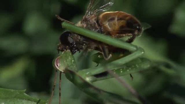 Богомол поедает муху.