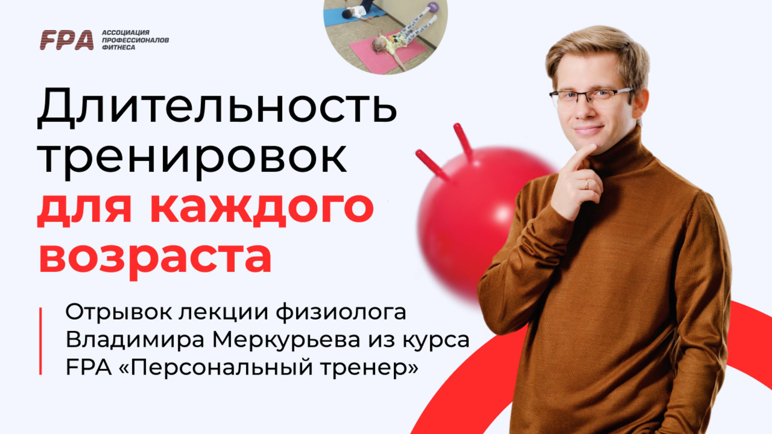 Длительность тренировок для каждого возраста. Рассказывает физиолог, к.б.н., эксперт-преподаватель FPA Владимир Меркурьев. Публикуем отрывок лекции по физиологии на тренерских курсах Ассоциации Профессионалов Фитнеса. __________ Ассоциация Профессионалов Фитнеса (FPA) - лидер на российском рынке фитнес-образования. С 2000 года в FPA сертифицировано более 25 000 специалистов. Наши выпускники работают более чем в 1000 клубах Москвы, России и стран зарубежья 👉 http://fitness-pro.ru/ __________ Дистанционные программы обучения: – Персональный фитнес-тренер: https://bit.ly/39A06Xr – Фитнес-нутрициолог: https://bit.ly/37oC14n — Инструктор групповых программ: https://bit.ly/3AUq3ip – Детский фитнес: https://bit.ly/34OjT4B __________ Очные программы обучения: – Персональный фитнес-тренер: https://bit.ly/2ONTH2K – Инструктор групповых программ: https://bit.ly/2uFh3Re __________ Мы в соцсетях: ВКонтакте: https://vk.com/fpafpa Telegram-канал: https://t.me/trenerskayaFPA Telegram-чат для тренеров: https://t.me/trenerskayaFPAchat Яндекс.Дзен: https://zen.yandex.ru/fitness_pro_ru