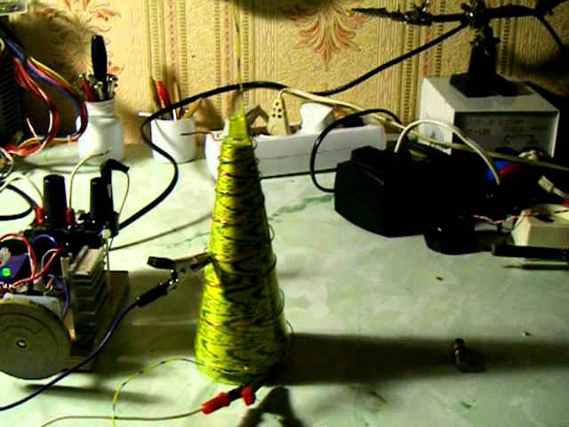 Вторичная обмотка сделана витой парой в виде конуса на одноразовый бокал для шампанского. Получилось около 140 витков. Длина намотки - 140 мм Основание конуса - 60 мм Верх конуса - 15 мм Индуктор - 8 витков - намотан на такой же пластиковый бокал, у которого отпилена ножка. Получился усечённый конус, который надевается сверху на вторичку. Напряжение питания 24 вольта.