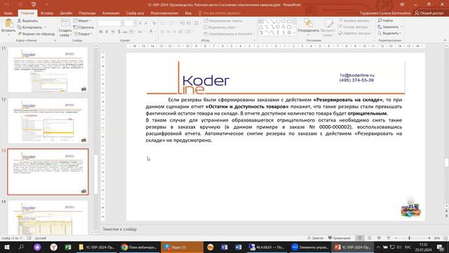 Компания «Кодерлайн» провела вебинар «1С:ERP. Производство. Рабочее место "Состояние обеспечения заказов" на примере 1С:ERP» Ведущая: Гардышева Галина - консультант-аналитик 1С:ERP Целевая аудитория для бухгалтеров, пользователей и специалистов ИТ-подразделений компаний различных отраслей. Описание Состояние обеспечения заказов – это рабочее место, предусмотренное для работы менеджера по продажам или начальника отдела продаж. В рабочем месте отображаются товары и аналогично многооборотная тара и работы. С его помощью определяется порядок запуска изделий в производство, выполняется создание необходимых резервов, достигается бесперебойное снабжение рабочих мест материалами и полуфабрикатами. Разбираться с настройками и заполнением справочников в этом разделе будем на примере 1С:ERP. Программа 1. Настройка рабочего места «Состояние обеспечения заказов»; 2. Переброска резервов между заказами; 3. Распределение запасов; 4. Отчеты по запасам; 5. Дополнительные сервисы, отчеты.