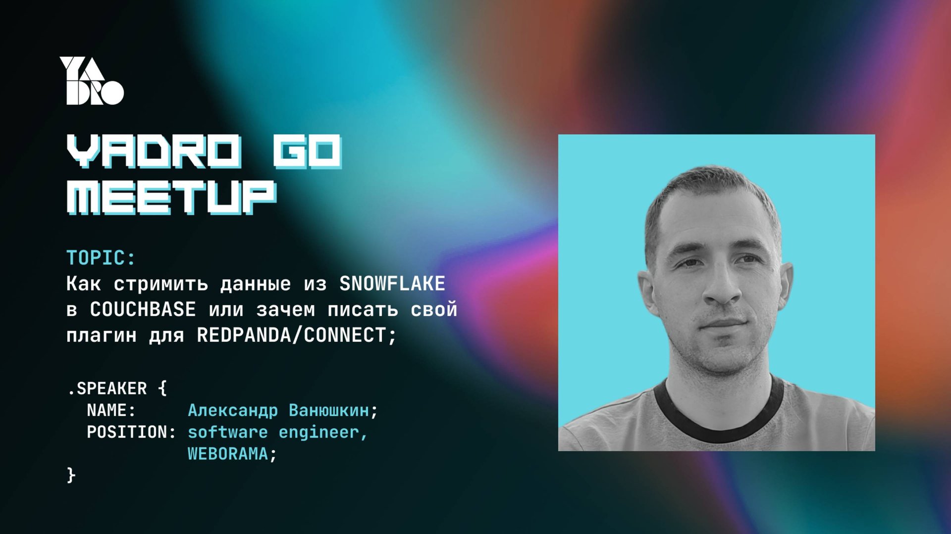 RTB (Real Time Bidding) — это технология аукциона в реальном времени, которая используется в онлайн-маркетинге для покупки и продажи рекламного пространства. Один из этапов заключается в сборе и обновлении данных о категориях, к которым принадлежат те или иные сайты. В нашей системе такие данные заносятся в БД Snowflake, и эти изменения необходимо оперативно транслировать в Couchbase. В данном докладе я расскажу, как мы это делаем, почему нам понадобилось писать плагин для сервиса потоковой обработки данных Redpanda/Connect и что в итоге осталось на продакшене. Александр Ванюшкин Software engineer, Weborama 00:00 - О докладчике и теме выступления 01:00 - Как стримить данные из Snowflake в Couchbase 17:43 - Вопросы докладчику