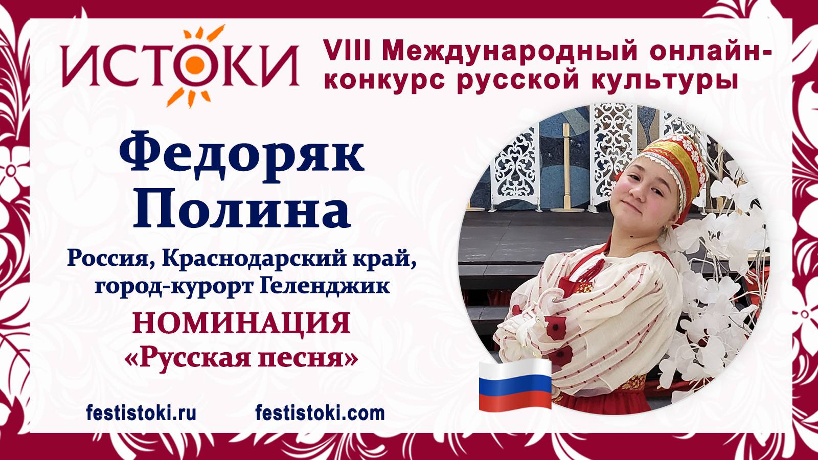 Участник VIII Международного онлайн-конкурса русской культуры "Истоки". Номинация "Русская песня". Русская народная песня из репертуара Лидии Руслановой "За горою у колодца". Сайт: festistoki.ru / festistoki.com E-mail: festistoki@mail.ru