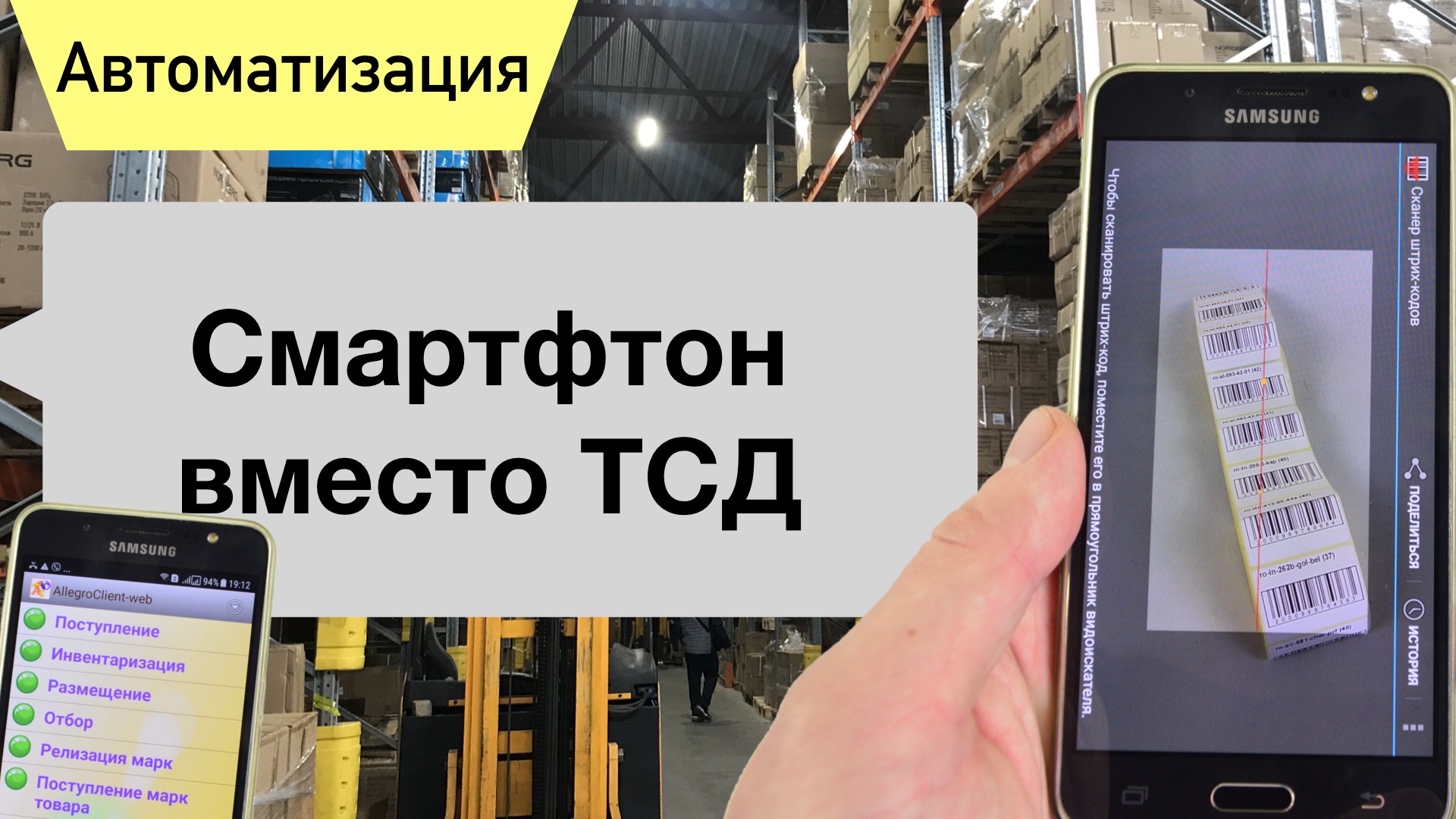 Обычный телефон на базе Android может использоваться как терминал сбора данных для работы на складе или в магазине. Все это возможно благодаря программе AllegroCount. https://allegrosoft.ru/n/programma-dlya-tsd-allegrocount 0:33 Просмотр остатков и цен 1:02 Создание отложенного чека с помощью Смартфона 1:32 Вывод документов из 1С на телефон 2:24 Итоги автоматизации склада AllegroSoft - https://allegrosoft.ru/ канал об автоматизации бизнеса ★Автоматизация магазина и склада, работа с маркировкой. ★Загрузка данных на ТСД из 1с. ★Ускорение комплектации и сбора заказов на 50%. ★Ускорение инвентаризации склада на 70%. ★Возможность автоматизации “ручных” процессов на складе/магазине. Заходите, смотрите и подписывайтесь на канал! Мы в интернете: ➧ Сайт - https://allegrosoft.ru/ ➧ Landing Page - https://sznak.ru/ ➧ Почта - info@allegrosoft.ru ➧ Телефон - +7 (499) 213-02-73 Наш канал: https://www.youtube.com/channel/UC-nZetl2JpigBRnS9rdmObQ