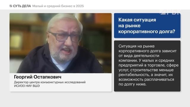 Подписывайтесь на канал: https://www.youtube.com/channel/UCD23js7wHnyG_yhimDMpLpg?sub_confirmation=1 --------------------- К началу 2025 деловая активность малого и среднего бизнеса ослабла. Об этом свидетельствует индекс малых и средних предприятий RSBI, который в декабре снизился до минимумов с 2023. Доля убыточных компаний за год выросла с 5% до 8%. Вероятность закрытия своего бизнеса допускает каждый четвертый предприниматель. Какова вероятность дефолтов в 2025. Какой на самом деле уровень безработицы в России. Кто поможет российскому бизнесу. И поможет ли вообще? В сути дела разбираются директор центра конъюнктурных исследований ИСИЭЗ НИУ ВШЭ Георгий Остапкович, управляющий директор по корпоративным рейтингам агентства «Эксперт РА» Гульназ Галиева и председатель Общероссийского движения предпринимателей Андрей Ковалёв. 00:00 Начинаем 00:30 С какими проблемами сейчас сталкивается малый и средний бизнес 02:20 Что происходит с темпами кредитования бизнеса 03:40 Какая ситуация на рынке корпоративного долга 05:56 Как дефицит кадров отражается на бизнес-показателях 08:38 Насколько велик риск банкротств предприятий в 2025 --------------------- #РБК #инвестиции #ставка --------------------- Подпишитесь на нас в соцсетях: Telegram-канал «Сам ты инвестор»: https://t.me/selfinvestor Telegram-бот «РБКарп Дивиденды»: https://web-telegram.ru/#/im?p=@Karpinvest_bot Рассылки РБК Инвестиции: https://investletter.rbc.ru/ VK: https://vk.com/rbc_investments