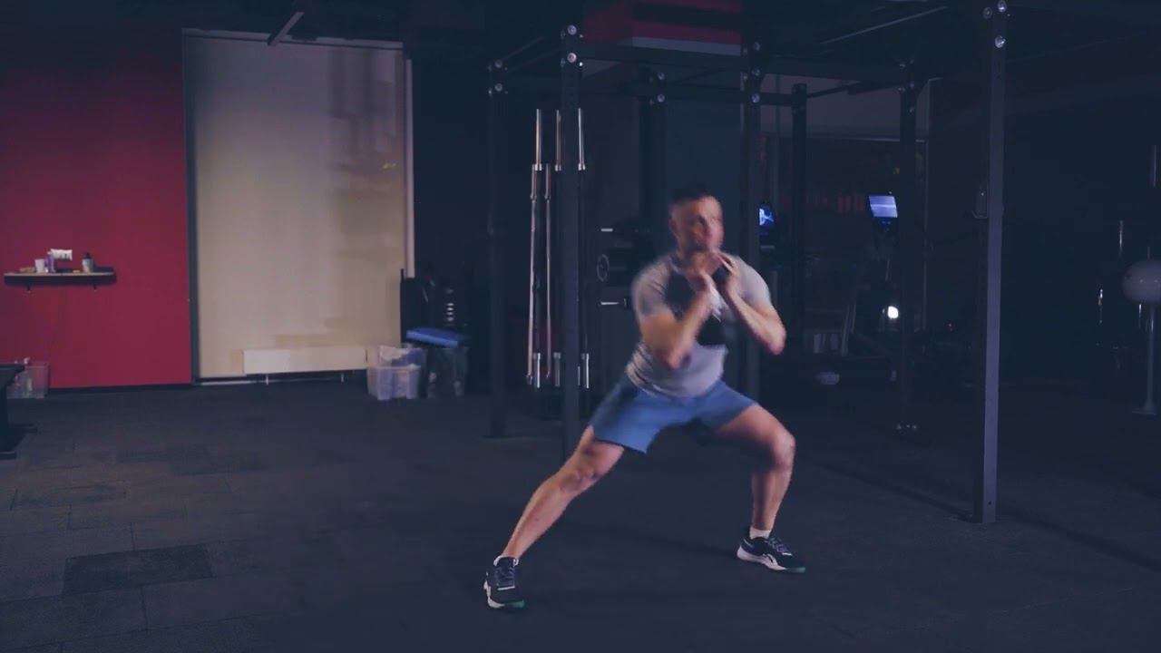 Попеременные латеральные выпады с гантелью на груди/ Alternative lateral DB lunge