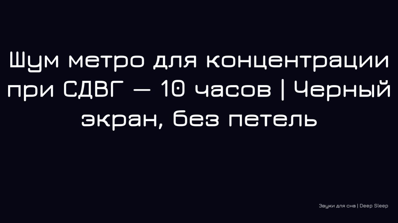 🚇 Ритмичный стук колес и монотонный гул подземки — этот звук помогает отключить внутренний диалог и сосредоточиться на важном. Идеально подходит для работы, учебы или чтения, особенно если вам трудно удерживать внимание из-за СДВГ. 🔹 Полная 10‑часовая версия с чёрным экраном, без петель и затуханий – только чистый, непрерывный шум вагона метро, создающий идеальный фоновый шум. 📥 Если хотите слушать без рекламы и скачивать видео в высоком качестве, заходите на Boosty: https://boosty.to/deep_noise_sleep Подписывайтесь на канал и делитесь в комментариях, какие звуки помогают сконцентрироваться именно вам! 🌙 Евгений / Deep Noise Sleep Теги: шум метро, для концентрации, СДВГ, 10 часов, фоновый шум, для работы, для учебы, белый шум, ритмичный шум, глубокий сон, релаксация, черный экран, без рекламы, скачать, subway noise, focus sounds