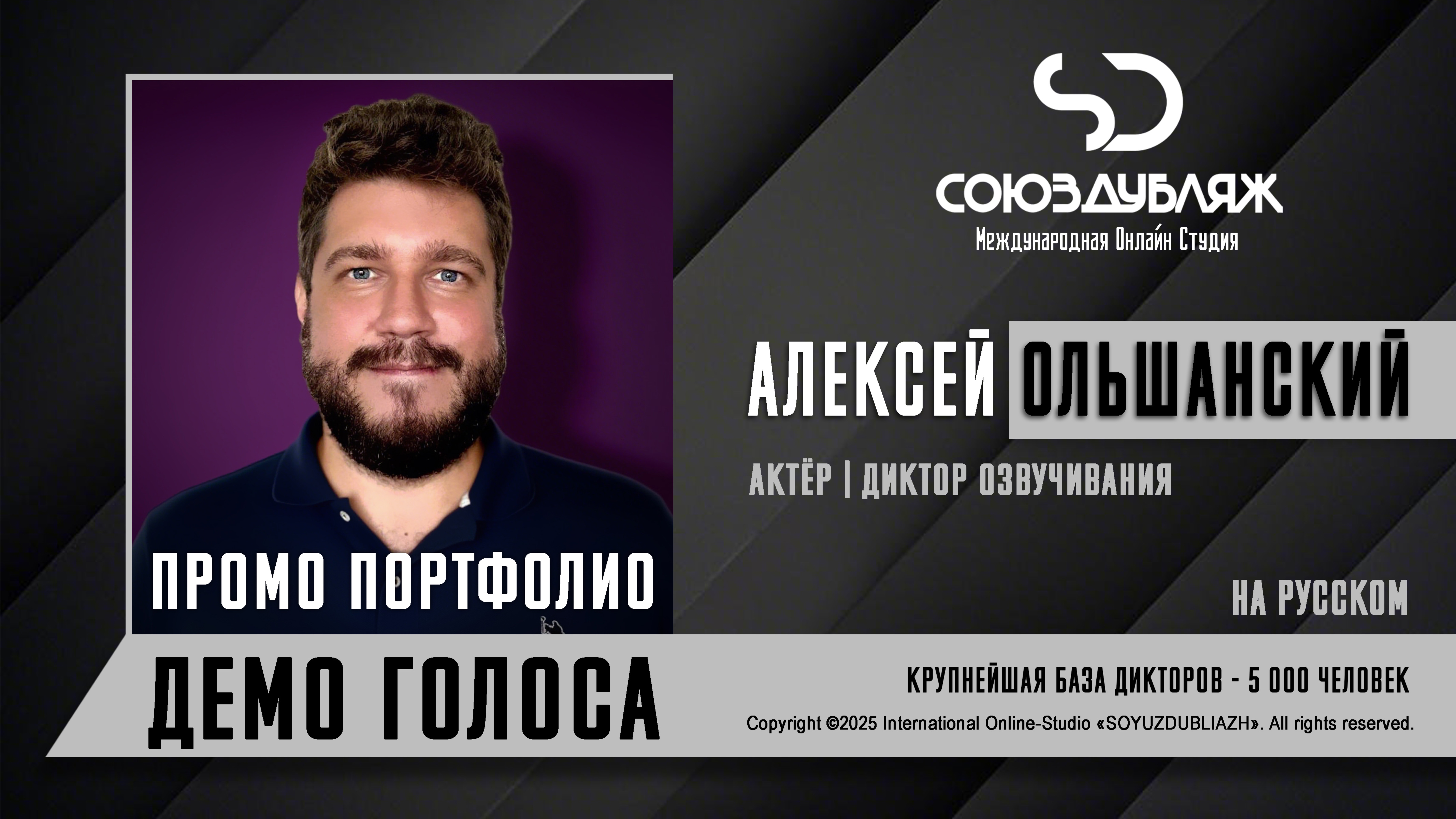#СоюзДубляж #БазаДикторов #Озвучка ✔️Алексей Ольшанский, актёр-диктор озвучивания. Международная Онлайн-Студия "СОЮЗДУБЛЯЖ" - профессиональная озвучка и дубляж. ▪️Рабочая группа в Телеграм: https://t.me/soyuzdubliazh ▪️Контакт для связи: https://t.me/SoyuzAdmin ▪️Подпишись:https://www.youtube.com/c/SOYUZDUBLIAZH ▪️Сайт: https://www.soyuzdubliazh.com/ Лучшие голоса для вашей аудиорекламы и видеороликов. База дикторов - 5 000 человек, профессионального уровня на ENG| FR| TR| RU| ISR| AZ| UA| KZ| UZ| языках. Мужские и Женские топовые голоса для озвучки любых проектов, таких как: Рекламы, Презентации, Фильмы, Сериалы, Игры, Мультфильмы, ТВ Шоу, Аудио-видео визитки. ✔️Сотрудничая с нами вы получаете свой проект под ключ, не выходя из дома или офиса. Наша слаженная команда из лучших дикторов, актёров озвучивания, режиссёров и звукорежиссёров в кратчайшие сроки озвучат или отдублируют ваш заказ на профессиональном уровне. Образцы работ нашего портфолио вы сможете посмотреть на канале СОЮЗДУБЛЯЖ. ВНИМАНИЕ: ✔️Мы приглашаем специалистов озвучки к сотрудничеству в нашей команде. Вы можете пройти по ссылке в наш телеграм канал и связаться с Админом для обсуждения. ✔️Всем заказчикам подобных медиа проектов по озвучки и дубляжу фильмов, сериалов, документалок обращаться непосредственно к Админу Телеграм группы СОЮЗДУБЛЯЖ, пройдя по ссылке: Проходи по ссылке: https://t.me/soyuzdubliazh International Online-Studio SOYUZDUDLIAZH presents a highly professional approach in voice-over and dubbing. ▪️Our working group https://t.me/soyuzdubliazh ▪️Chief manager https://t.me/SoyuzAdmin ▪️Follow https://www.youtube.com/c/SOYUZDUDLIAZH ▪️Web: https://www.soyuzdubliazh.com/ We offer You the best Voices for your Audio commercials and Video`s. Our Database contains over 5 000 voices of native speakers and high-class foreign language specialists in ENG| FR| TR| RU| ISR| AZ| UA| KZ| UZ|. Male & Female top level voices for all the variety of dubbing projects such as commercials, presentations, movies, TV-series, video and computer games, cartoons, TV-shows, audio & video portfolio’s – all in one place. As your business partner we guarantee a turn-key project without you leaving your house or office. Our target is to make sure that the dubbing of your project is made as quick as possible by a well-coordinated and professional team of the best speakers, film and sound directors. To whom it may concern! We invite dubbing specialists to join our team. Please contact our manager on Telegram https://t.me/soyuzdubliazh